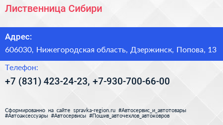 Лиственница Сибири по адресу 606030, Нижегородская область, Дзержинск, Попова, 13 в дальнейшем Организация, размещена в следующих категориях: