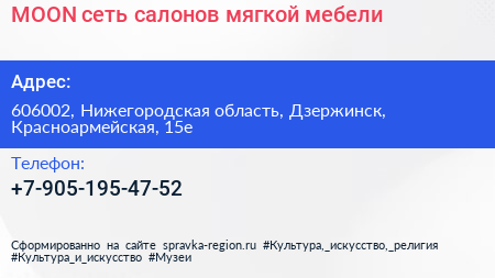 MOON, сеть салонов мягкой мебели по адресу 606002, Нижегородская область, Дзержинск, Красноармейская, 15е в дальнейшем Организация, размещена в следующих категориях: