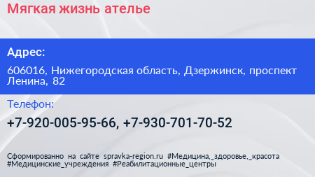 Мягкая жизнь, ателье по адресу 606016, Нижегородская область, Дзержинск, проспект Ленина, 82 в дальнейшем Организация, размещена в следующих категориях: