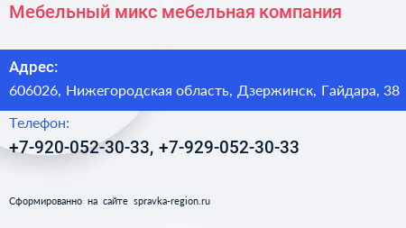 Мебельный микс, мебельная компания по адресу 606026, Нижегородская область, Дзержинск, Гайдара, 38 в дальнейшем Организация, размещена в следующих категориях: