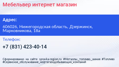 Мебельвер, интернет-магазин по адресу 606026, Нижегородская область, Дзержинск, Марковникова, 18а в дальнейшем Организация, размещена в следующих категориях: