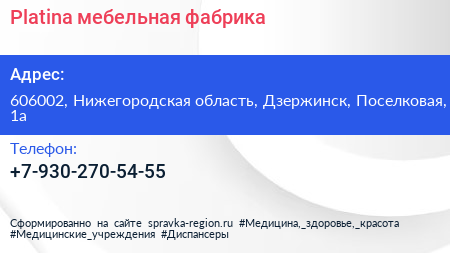 Platina, мебельная фабрика по адресу 606002, Нижегородская область, Дзержинск, Поселковая, 1а в дальнейшем Организация, размещена в следующих категориях: