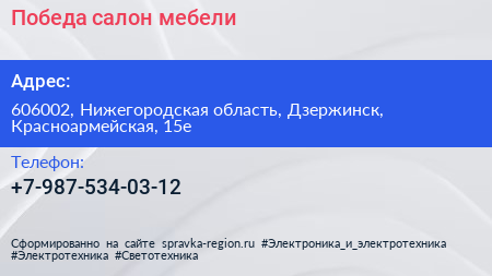 Победа, салон мебели по адресу 606002, Нижегородская область, Дзержинск, Красноармейская, 15е в дальнейшем Организация, размещена в следующих категориях: