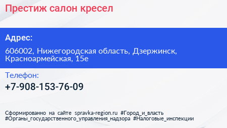 Престиж, салон кресел по адресу 606002, Нижегородская область, Дзержинск, Красноармейская, 15е в дальнейшем Организация, размещена в следующих категориях: