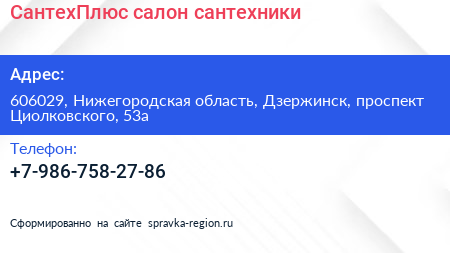 СантехПлюс, салон сантехники по адресу 606029, Нижегородская область, Дзержинск, проспект Циолковского, 53а в дальнейшем Организация, размещена в следующих категориях: