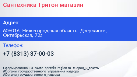 Сантехника Тритон, магазин по адресу 606016, Нижегородская область, Дзержинск, Октябрьская, 72а в дальнейшем Организация, размещена в следующих категориях: