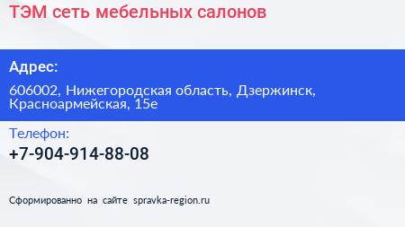 ТЭМ, сеть мебельных салонов по адресу 606002, Нижегородская область, Дзержинск, Красноармейская, 15е в дальнейшем Организация, размещена в следующих категориях: