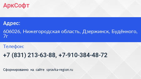 АркСофт по адресу 606026, Нижегородская область, Дзержинск, Будённого, 7г в дальнейшем Организация, размещена в следующих категориях: