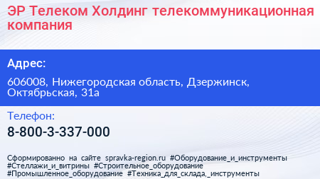 ЭР-Телеком Холдинг, телекоммуникационная компания по адресу 606008, Нижегородская область, Дзержинск, Октябрьская, 31а в дальнейшем Организация, размещена в следующих категориях: