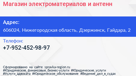 Магазин электроматериалов и антенн по адресу 606024, Нижегородская область, Дзержинск, Гайдара, 2 в дальнейшем Организация, размещена в следующих категориях:
