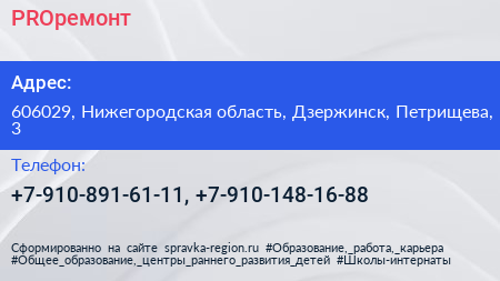 PROремонт по адресу 606029, Нижегородская область, Дзержинск, Петрищева, 3 в дальнейшем Организация, размещена в следующих категориях:
