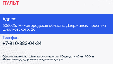 ПУЛЬТ+ по адресу 606025, Нижегородская область, Дзержинск, проспект Циолковского, 26 в дальнейшем Организация, размещена в следующих категориях: