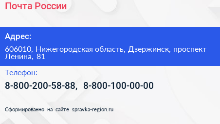 Почта России по адресу 606010, Нижегородская область, Дзержинск, проспект Ленина, 81 в дальнейшем Организация, размещена в следующих категориях: