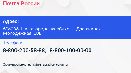 Почта России по адресу 606036, Нижегородская область, Дзержинск, Молодёжная, 10Б в дальнейшем Организация, размещена в следующих категориях: