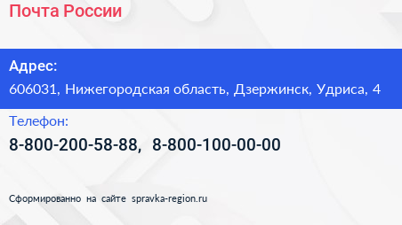 Почта России по адресу 606031, Нижегородская область, Дзержинск, Удриса, 4 в дальнейшем Организация, размещена в следующих категориях: