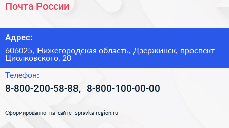 Почта России по адресу 606025, Нижегородская область, Дзержинск, проспект Циолковского, 20 в дальнейшем Организация, размещена в следующих категориях: