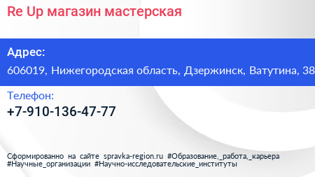 Re-Up, магазин-мастерская по адресу 606019, Нижегородская область, Дзержинск, Ватутина, 38 в дальнейшем Организация, размещена в следующих категориях: