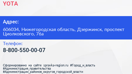 YOTA по адресу 606034, Нижегородская область, Дзержинск, проспект Циолковского, 76а в дальнейшем Организация, размещена в следующих категориях: