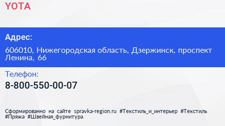 YOTA по адресу 606010, Нижегородская область, Дзержинск, проспект Ленина, 66 в дальнейшем Организация, размещена в следующих категориях: