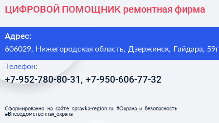 ЦИФРОВОЙ ПОМОЩНИК, ремонтная фирма по адресу 606029, Нижегородская область, Дзержинск, Гайдара, 59г в дальнейшем Организация, размещена в следующих категориях: