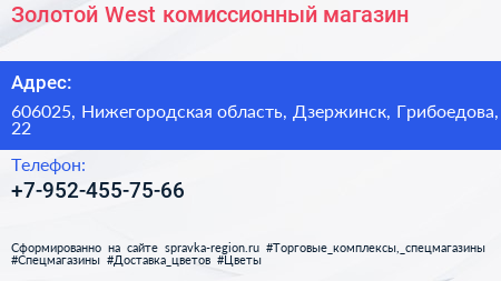 Золотой West, комиссионный магазин по адресу 606025, Нижегородская область, Дзержинск, Грибоедова, 22 в дальнейшем Организация, размещена в следующих категориях: