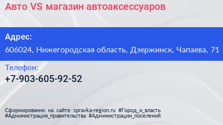 Авто-VS, магазин автоаксессуаров по адресу 606024, Нижегородская область, Дзержинск, Чапаева, 71 в дальнейшем Организация, размещена в следующих категориях: