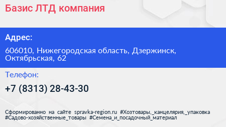 Базис ЛТД, компания по адресу 606010, Нижегородская область, Дзержинск, Октябрьская, 62 в дальнейшем Организация, размещена в следующих категориях: