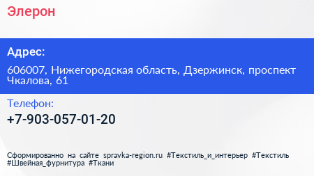 Элерон по адресу 606007, Нижегородская область, Дзержинск, проспект Чкалова, 61 в дальнейшем Организация, размещена в следующих категориях: