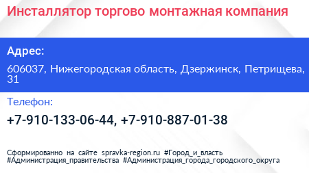 Инсталлятор, торгово-монтажная компания по адресу 606037, Нижегородская область, Дзержинск, Петрищева, 31 в дальнейшем Организация, размещена в следующих категориях: