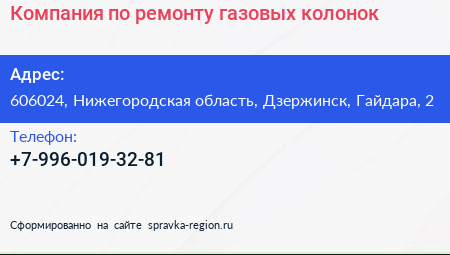 Компания по ремонту газовых колонок по адресу 606024, Нижегородская область, Дзержинск, Гайдара, 2 в дальнейшем Организация, размещена в следующих категориях: