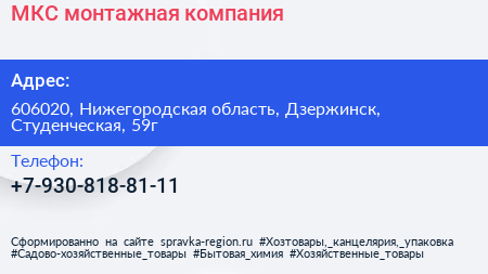 МКС, монтажная компания по адресу 606020, Нижегородская область, Дзержинск, Студенческая, 59г в дальнейшем Организация, размещена в следующих категориях: