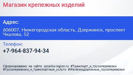 Магазин крепежных изделий по адресу 606007, Нижегородская область, Дзержинск, проспект Чкалова, 52 в дальнейшем Организация, размещена в следующих категориях: