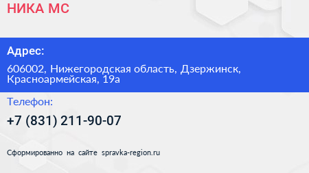 НИКА-МС по адресу 606002, Нижегородская область, Дзержинск, Красноармейская, 19а в дальнейшем Организация, размещена в следующих категориях: