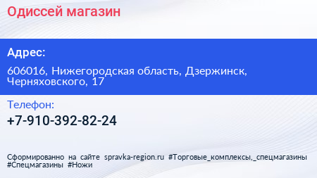 Одиссей, магазин по адресу 606016, Нижегородская область, Дзержинск, Черняховского, 17 в дальнейшем Организация, размещена в следующих категориях: