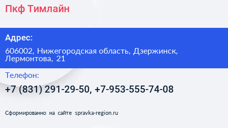 Пкф Тимлайн по адресу 606002, Нижегородская область, Дзержинск, Лермонтова, 21 в дальнейшем Организация, размещена в следующих категориях: