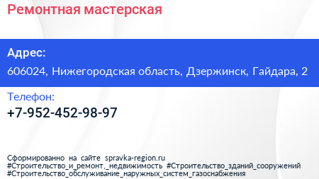Ремонтная мастерская по адресу 606024, Нижегородская область, Дзержинск, Гайдара, 2 в дальнейшем Организация, размещена в следующих категориях: