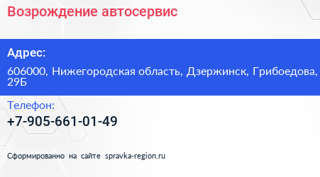Возрождение, автосервис по адресу 606000, Нижегородская область, Дзержинск, Грибоедова, 29Б в дальнейшем Организация, размещена в следующих категориях:
