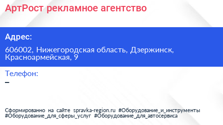 АртРост, рекламное агентство по адресу 606002, Нижегородская область, Дзержинск, Красноармейская, 9 в дальнейшем Организация, размещена в следующих категориях: