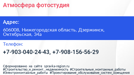 Атмосфера, фотостудия по адресу 606008, Нижегородская область, Дзержинск, Октябрьская, 34а в дальнейшем Организация, размещена в следующих категориях:
