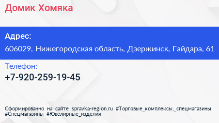 Домик Хомяка по адресу 606029, Нижегородская область, Дзержинск, Гайдара, 61 в дальнейшем Организация, размещена в следующих категориях: