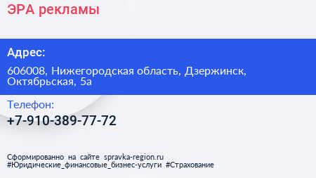 ЭРА рекламы по адресу 606008, Нижегородская область, Дзержинск, Октябрьская, 5а в дальнейшем Организация, размещена в следующих категориях: