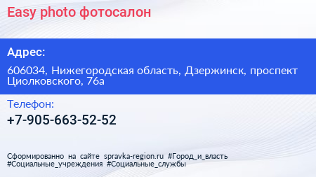 Easy photo, фотосалон по адресу 606034, Нижегородская область, Дзержинск, проспект Циолковского, 76а в дальнейшем Организация, размещена в следующих категориях: