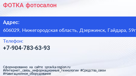 ФОТКА, фотосалон по адресу 606029, Нижегородская область, Дзержинск, Гайдара, 59г в дальнейшем Организация, размещена в следующих категориях: