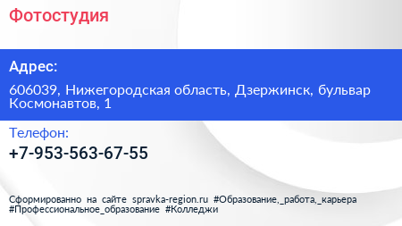 Фотостудия по адресу 606039, Нижегородская область, Дзержинск, бульвар Космонавтов, 1 в дальнейшем Организация, размещена в следующих категориях:
