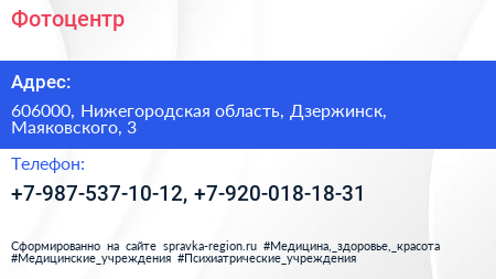Фотоцентр по адресу 606000, Нижегородская область, Дзержинск, Маяковского, 3 в дальнейшем Организация, размещена в следующих категориях:
