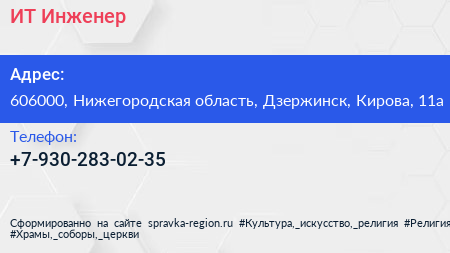ИТ-Инженер по адресу 606000, Нижегородская область, Дзержинск, Кирова, 11а в дальнейшем Организация, размещена в следующих категориях: