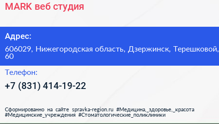 MARK, веб-студия по адресу 606029, Нижегородская область, Дзержинск, Терешковой, 60 в дальнейшем Организация, размещена в следующих категориях: