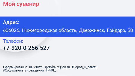 Мой сувенир по адресу 606026, Нижегородская область, Дзержинск, Гайдара, 58 в дальнейшем Организация, размещена в следующих категориях: