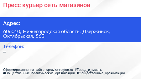 Пресс курьер, сеть магазинов по адресу 606010, Нижегородская область, Дзержинск, Октябрьская, 56Б в дальнейшем Организация, размещена в следующих категориях: