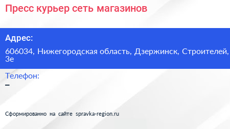Пресс курьер, сеть магазинов по адресу 606034, Нижегородская область, Дзержинск, Строителей, 3е в дальнейшем Организация, размещена в следующих категориях: